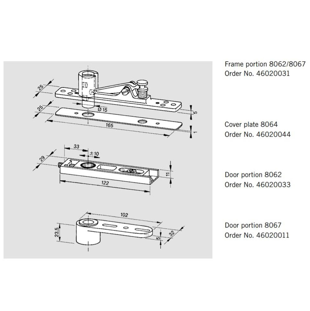 Door portion 8062. Accessories for BTS floor springs: Top center with needle bearing 8062 for double action doors, zink alloy