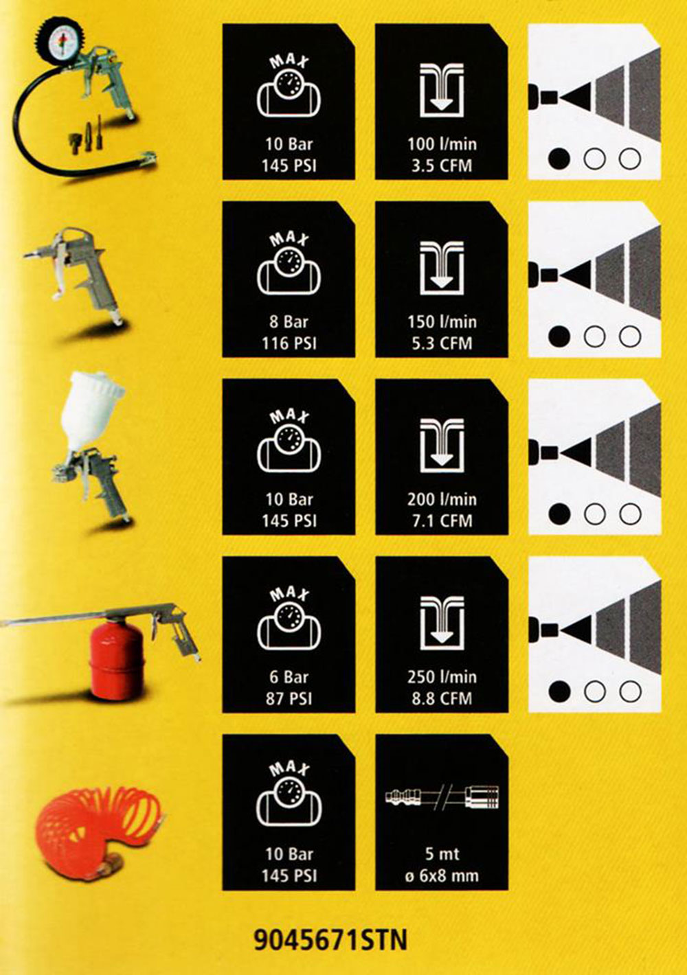 Περιλαμβάνει πετρελιέρα, αερόμετρο, πιστόλι βαφής, πιστόλι αέρος αντάπτορες και σωλήνα 5Μ