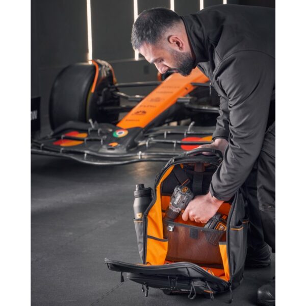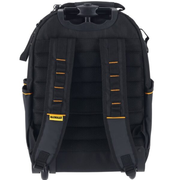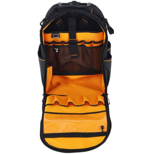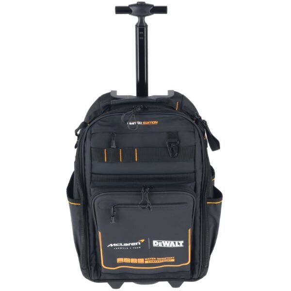 Επαγγελματικό σακίδιο πλάτης Β.Τ. DEWALT PRO MCLAREN. Στιβαρή κατασκευή με πληθώρα θηκών εσωτερικών & εξωτερικών. Διαθέτει στεγανή θήκη για κινητά, έγγραφα,ι θέση Laptop και φερμουάρ B.T.. Επίσης διαθέτει ροδάκια και τηλεσκοπική λαβή έλξης για ευκολη μεταφορά. Πιστοποίηση IP54, Υφάσμα 1680denier. Μέγιστο βάρος 25kg,. Διαστ.: 350χ240χ540mm