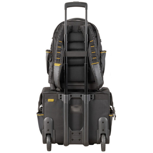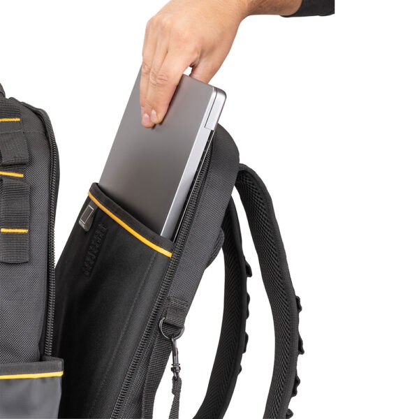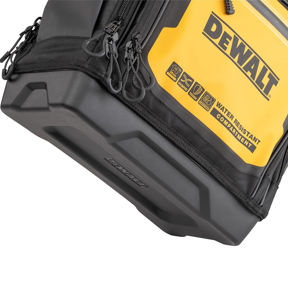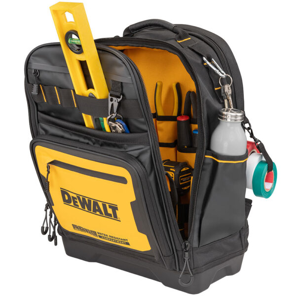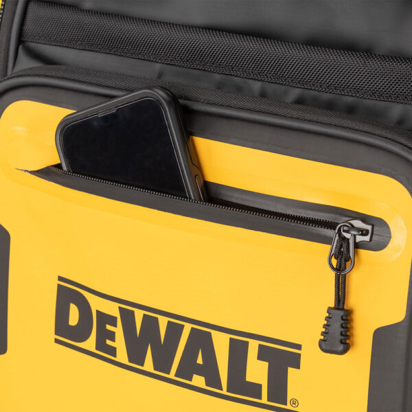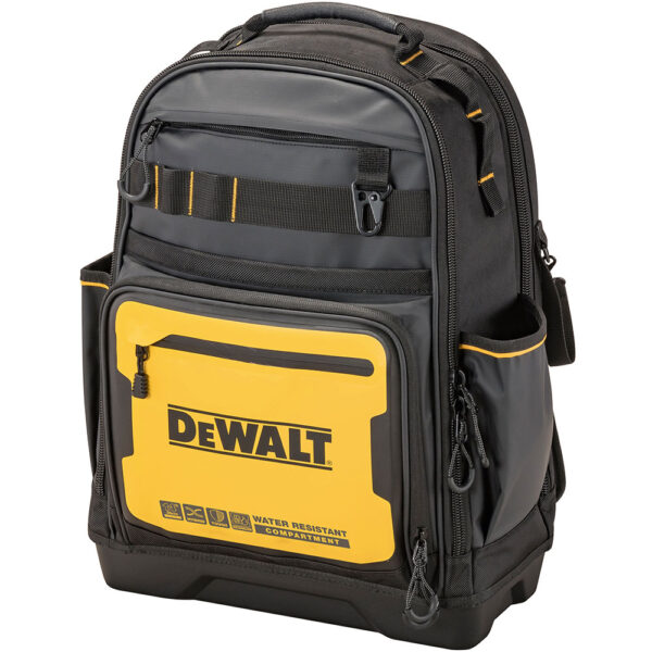 Επαγγελματικό σακίδιο πλάτης Β.Τ. DEWALT PRO με ρυθμιζόμενους ιμάντες και επιπλέον ιμάντα στερέωσης σε τροχήλατη εργαλειοθήκη. Στιβαρή κατασκευή με πληθώρα θηκών εσωτερικών & εξωτερικών. Διαθέτει στεγανή θήκη για κινητά, έγγραφα κλπ Διαστ:32x20x48cm. IP54 1680denier. Μέγιστο βάρος 25kg