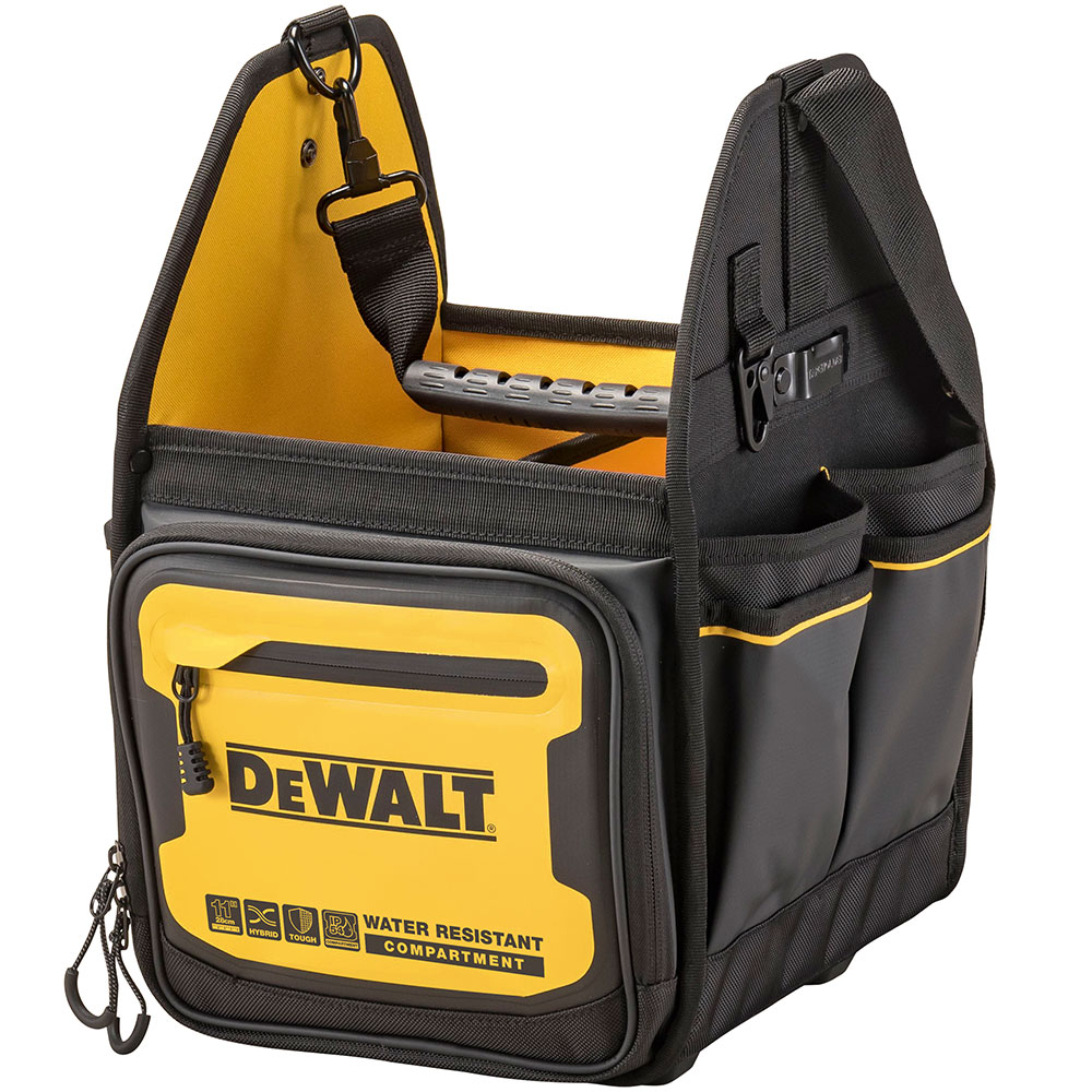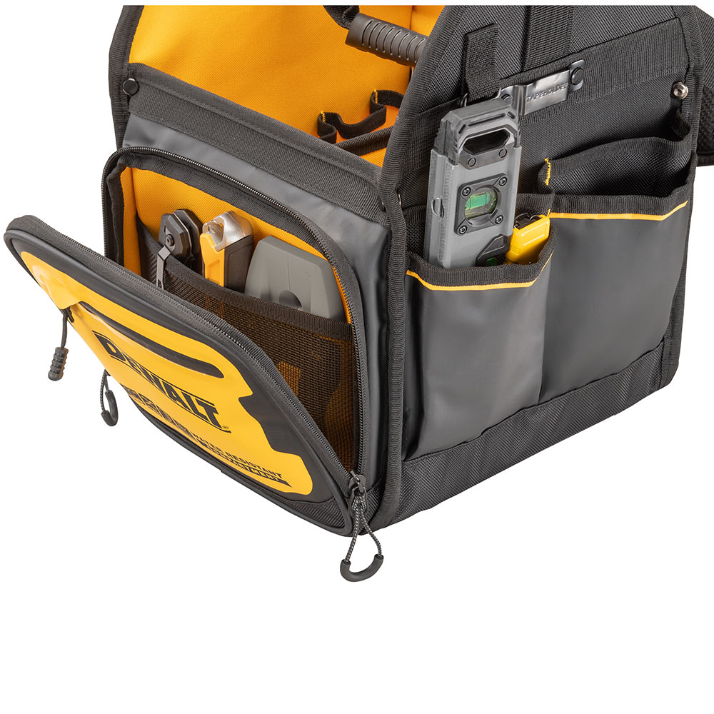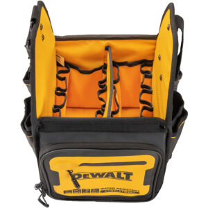 Επαγγελματική ανοιχτή εργαλειοθήκη DEWALT PRO 11″ με ιμάντα ώμου, 34 θήκες εσωτερικές, εξωτερικές και αδιάβροχη θήκη για κινητό τηλέφωνο, έγγραφα κλπ Διαστ:28x24x41cm. IP54 1680denier. Μέγιστο βάρος 25kg