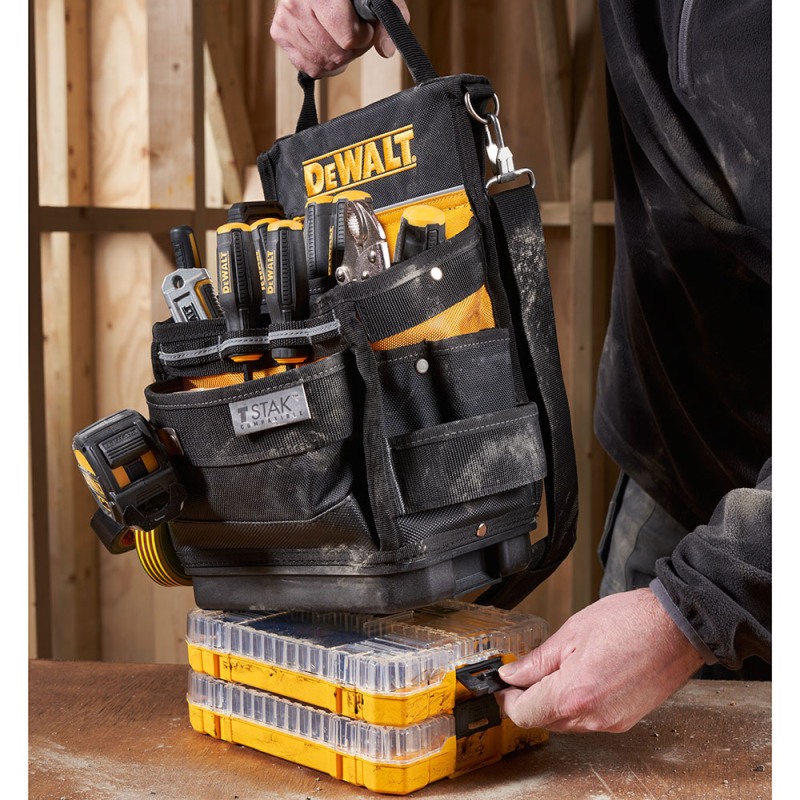 Ανθεκτική υφασμάτινη κατασκευή 1680 Denier Ballistic Nylon, επιτρέπει εύκολη εύρεση εργαλείου κ.α. Εσωτερικές και εξωτερικές θήκες αποθήκευσης εργαλείων. Ενισχυμένη βάση ανθεκτική στο νερό. Μέρος του συστήματος εργαλειοθηκών TSTAK. Μέγιστο βάρος 10,2kg