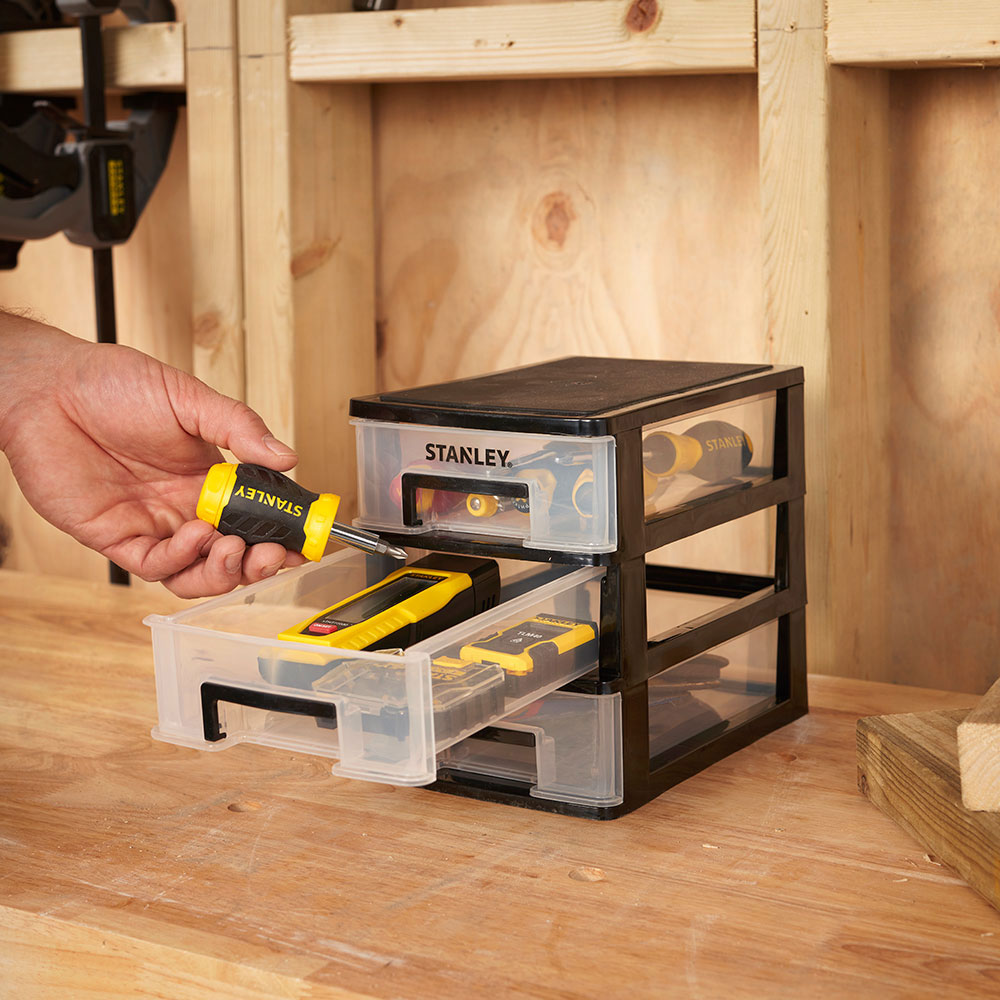 Συρταριέρα αποθηκευσης απο διαφανές πολυπροπυλένιο για αντοχή και ευκολη ευρεση. Τα συρτάρια διαθέτουν στόπερ και δύναται να τοποθετηθούν το ένα επάνω στο άλλο. Διαστάσεις:21,5x15x19cm