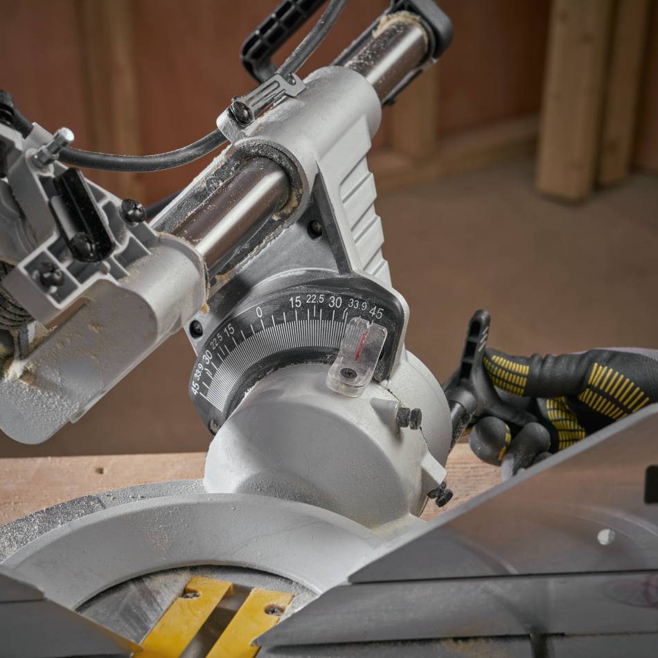 Ιισχυρός κινητήρας 1800W παρέχει αρκετή ροπή,Οριζόντια λαβή και διακόπτης σκανδάλης κλειδώματος.Ευκρινής γραμμή κοπής με LED. Συρόμενη ράβδος με αντισκωριακή επίστρωση για ανετη εργασία,