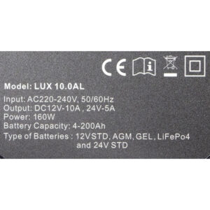 Τάση λειτουργίας: 220-240V, 50/60Hz. Μέγιστη ισχύς εισόδου: 160W. Ρεύμα φόρτισης (12V STD/AGM/LFP): έως 10A . Λειτουργία συντήρησης (MAINTAIN): 1A . Λειτουργία φόρτισης 24V STD: 5A. Χωρητικότητα μπαταριών: 3–200 Ah. SUPPLY: Έως 10A. RECOND: 16.5V DC / 1.5A. Κλάση προστασίας: II. Βαθμός στεγανότητας: IP65