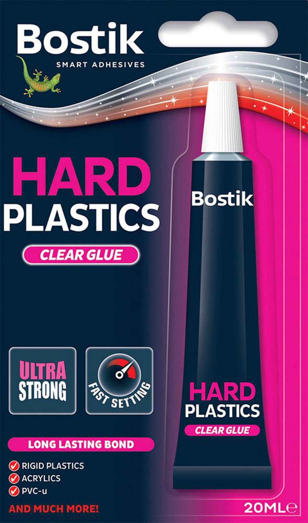 Το Bostik Hard Plastics είναι ένα extra δυνατό, διάφανο συγκολλητικό που στεγνώνει γρήγορα και είναι ανθεκτικό στην υγρασία και το νερό. Ιδανικό για δύσκολες επιδιορθώσεις στα περισσότερα σκληρά, διάφανα και άκαμπτα πλαστικά, συμπεριλαμβανομένων ακρυλικών και σκληρών PVC.
