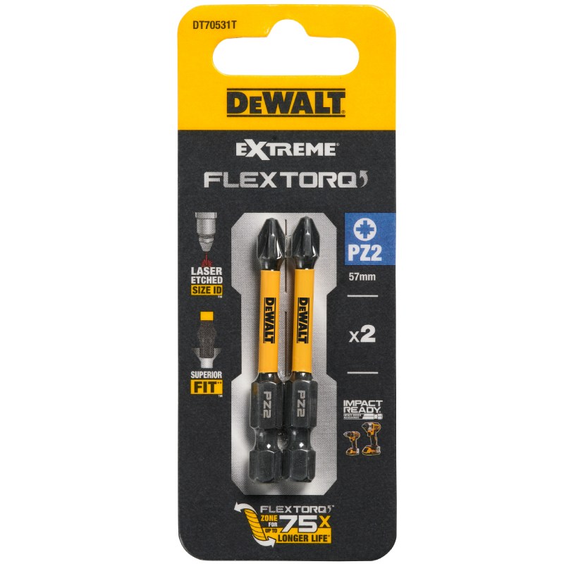 Επαγγελματικές μύτες . Καινοτόμα τεχνολογία DeWalt Flextorq εξασφαλίζει μεγάλη διάρκεια ζωής σε σχέση με τις απλές μύτες, καλύτερο ελεγχο και ακρίβεια κατά το βίδωμα και ανεμπόδιστη εργασία σε απαιτητικές εφαρμογές που χρειάζονται υψηλή ροπή.