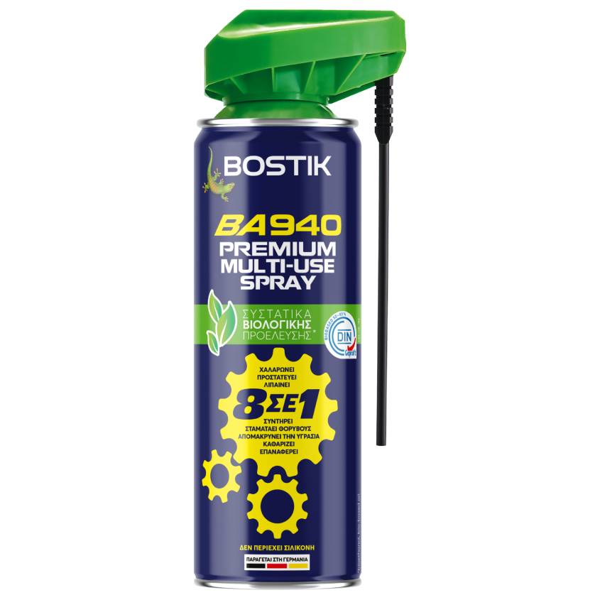 Το BA940 είναι ένα premium multi-use spray νέας τεχνολογίας βασισμένο σε συστατικά βιολογικής προέλευσης 50 – 85%. Χαλαρώνει κολλημένα εξαρτήματα και μηχανισμούς και προστατεύει από την σκουριά και την διάβρωση τα μεταλλικά μέρη. Λιπαίνει και επιτρέπει την κίνηση σε μηχανισμούς και γλίστρες και συντηρεί εργαλεία και μηχανισμούς. Σταματάει κάθε είδους τριξίματα που προέρχονται από τριβή. Καθαρίζει όλων των ειδών τις βρωμιές από επιφάνειες όπως ακαθαρσίες, γράσα, υπολείμματα κλπ. Απομακρύνει την υγρασία από δυσπρόσιτες περιοχές και επαναφέρει σε λειτουργία ηλεκτρικές επαφές.