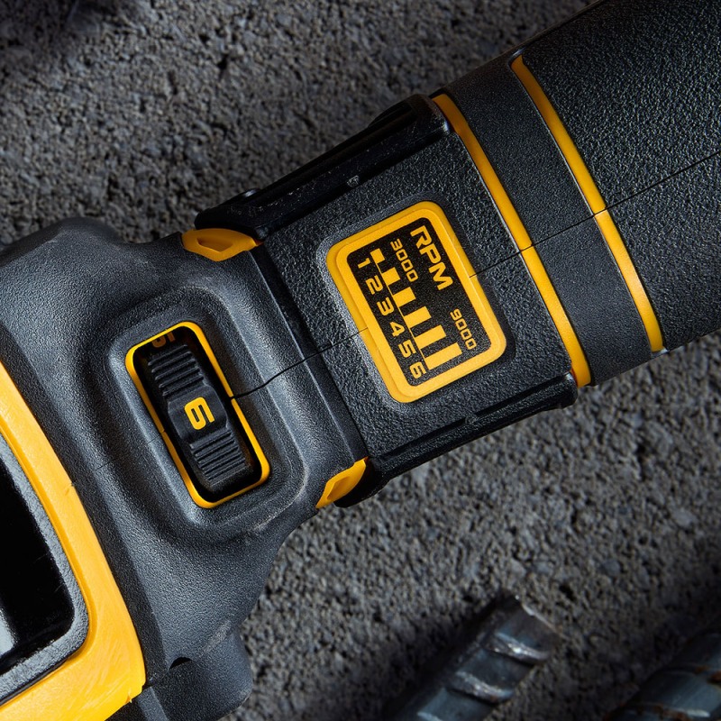 Επαγγελματικός ρυθμιζόμενος γωνιακός τροχός FLEXVOLT BRUSHLESS, PERFORM & PROTECT. Κατάλληλος για επίπονη εργασία χωρίς καταπόνηση του χρήστη. Διαμ:125mm, Ταχύτητα χωρίς φορτίο 3000-9000rpm. Βάρος 1,80kg. Διαθέτει διακόπτη με αποσύμπλεξη σε απουσία τάσης, Ηλεκτρονικό συμπλέκτη E-CLUTCH, Ηλεκτρονικό φρένο Kikcback-brake,Προστασία από υπερφόρτωση POWER OFF, λειτουργία ομαλής εκκίνησης SOFT START. αντικραδασμική πλαινή λαβή. προφυλακτήρας ONE TOUCH, Διάμετρος άξονα:Μ14